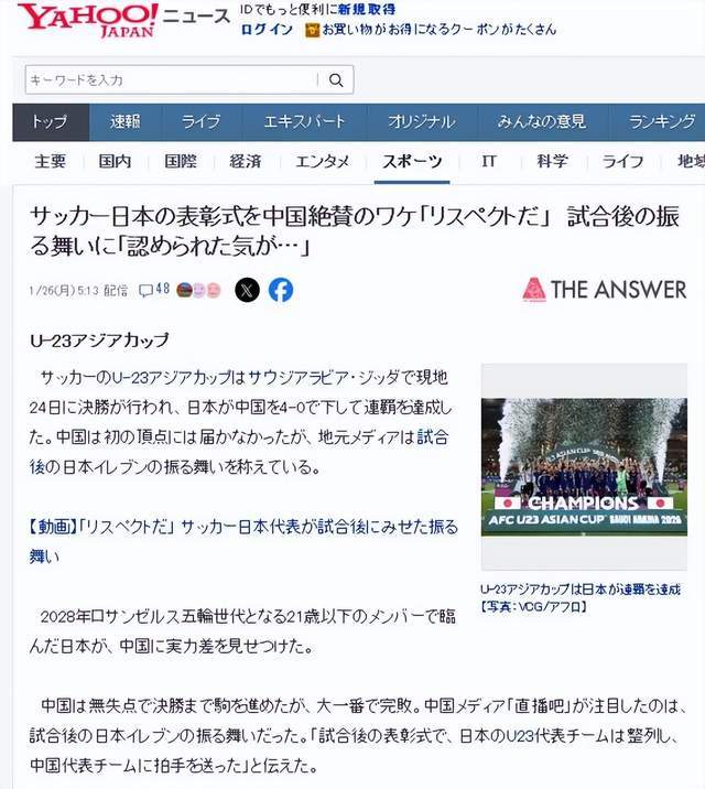 虽然中国U23在决赛中0比4不敌日本,最后只拿到亚军,但是日本球员却在赛后向中国队列队送上颁奖台,给予这支中国队极大的尊重,日本媒体对此也进行了报道。
