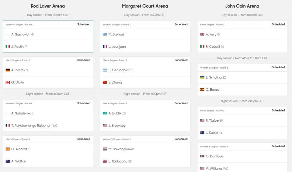 澳网首日重点赛程时刻表(北京时间)